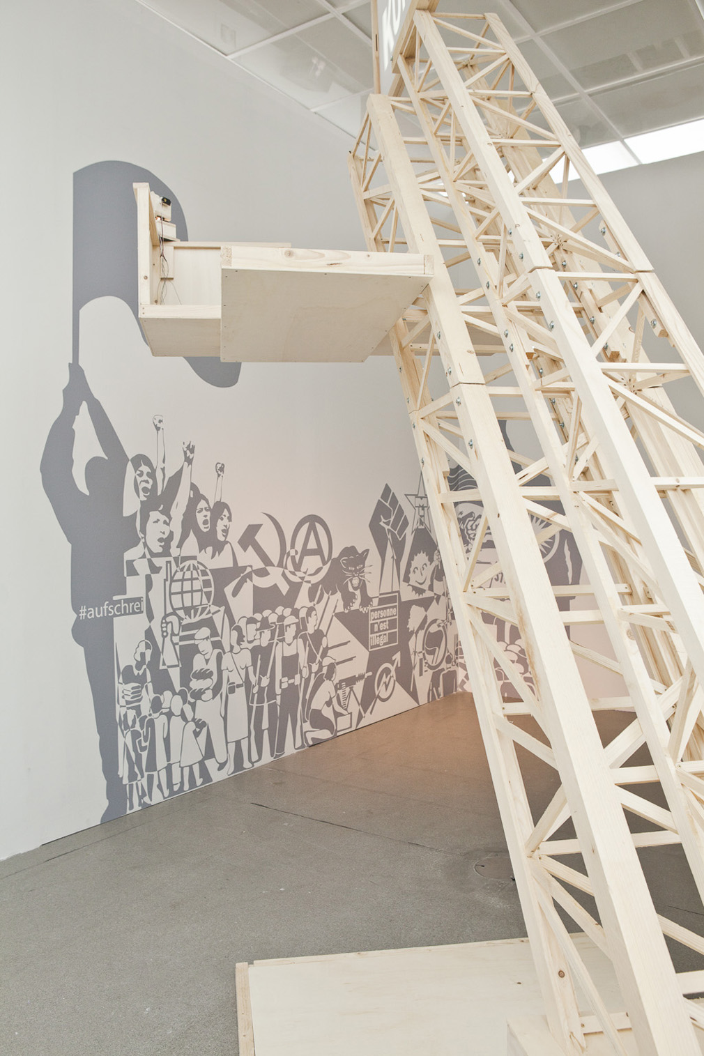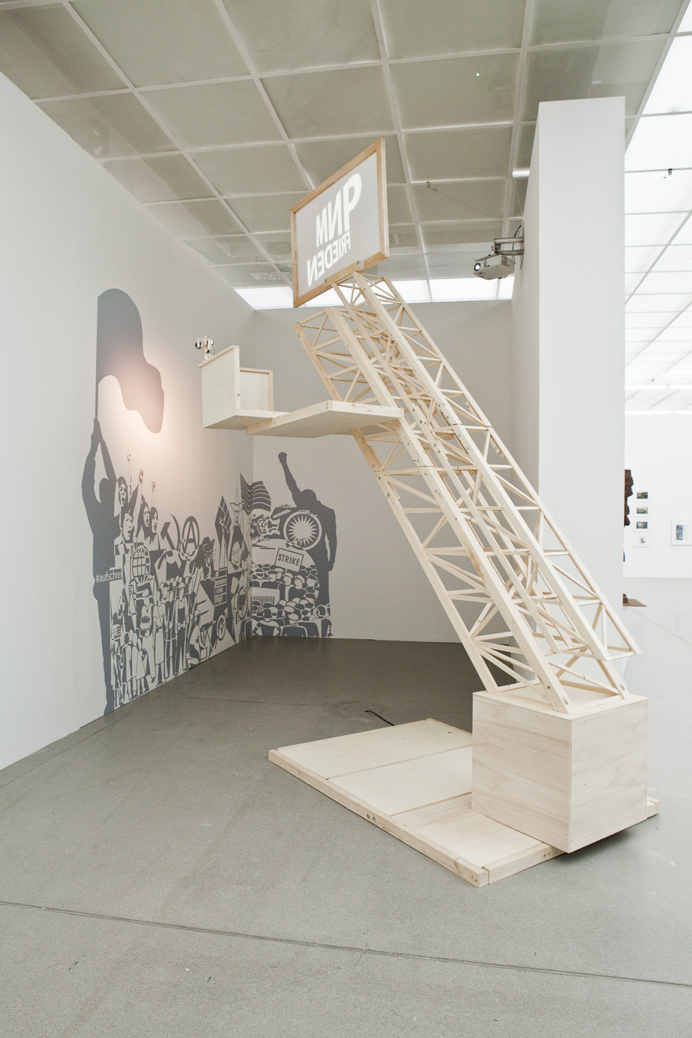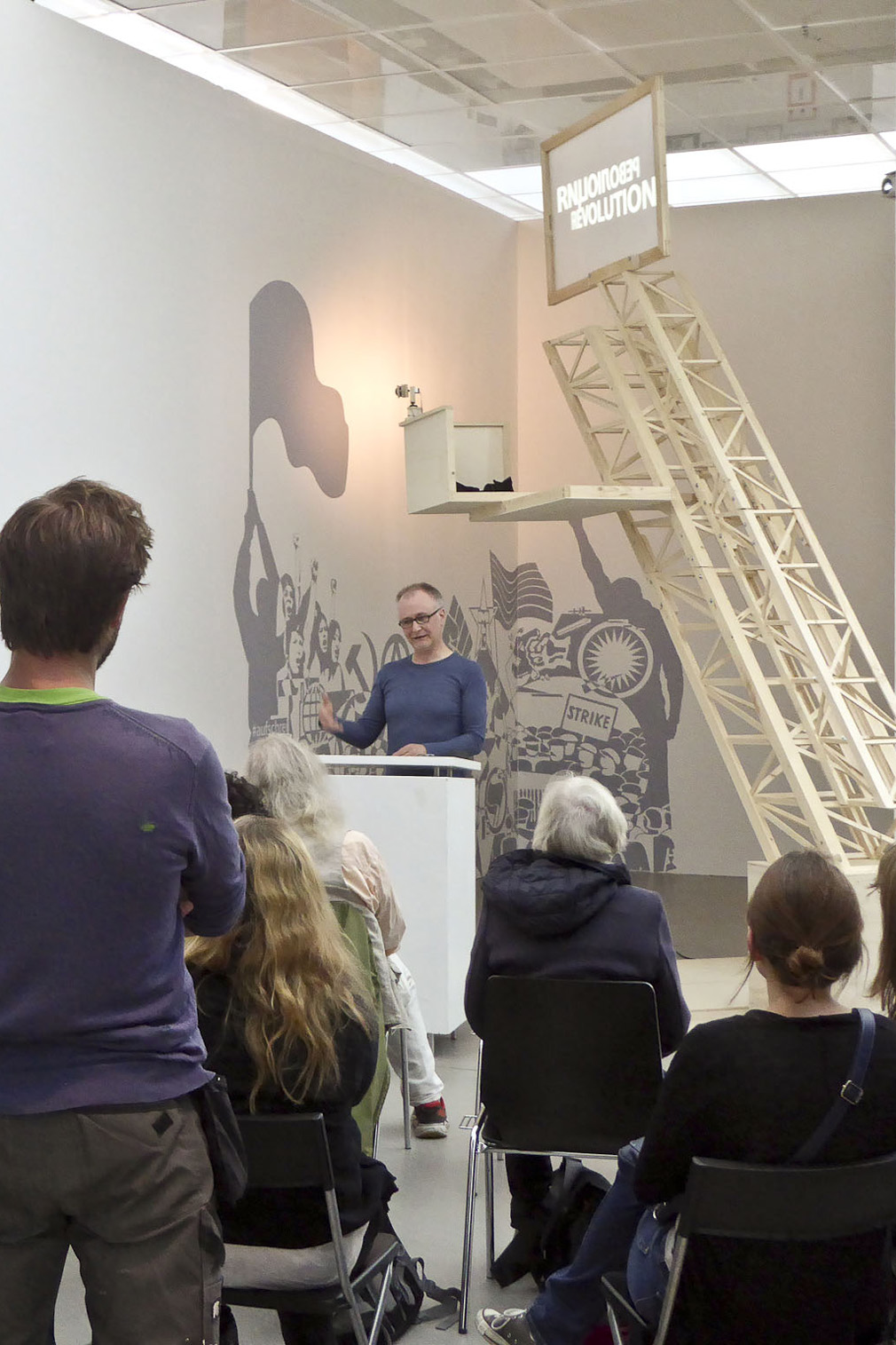 Das Zentrum der Installation ist der verkleinerte Nachbau der Lenin-Tribüne nach einem nicht realisierten Entwurf von El Lissitzky aus dem Jahr 1920. Anstatt des Redners Lenin befindet sich auf der Plattform der Tribüne eine Art Suchscheinwerfer. Dessen Kegel irrlichtert durch den Raum und bleibt dabei immer wieder an Einzelelementen eines Wandbildes hängen.