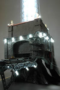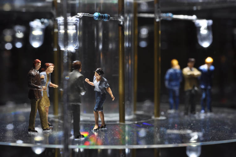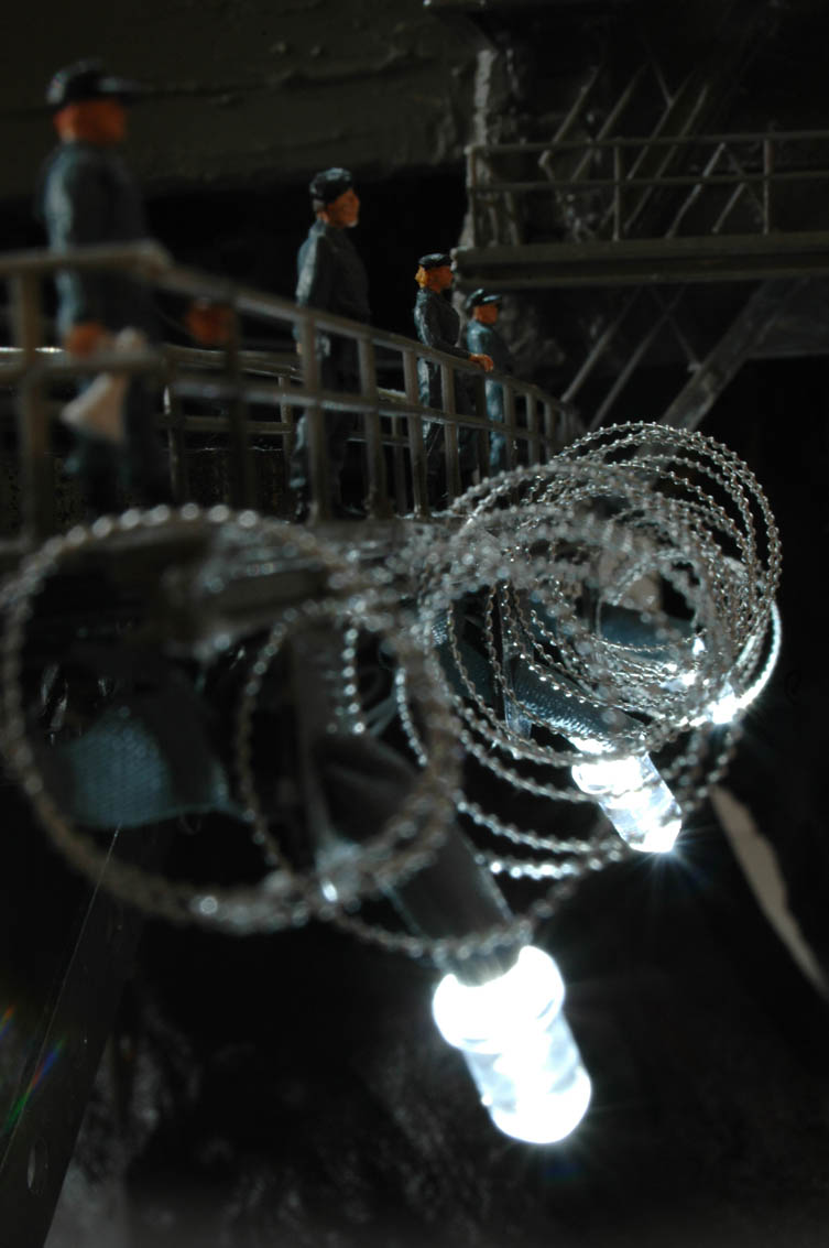 "Der Künstler Peter Schmidt aus Baden-Württemberg setzt sich in seiner Kunstinstallation "Festung Europa" mit den Außengrenzen Europas auseinander. Er hat ein detailreiches Modell geschaffen, in dessen Mitte eine Festung aus dem Meer aufragt. Stacheldraht und uniformierte Grenzschützer schirmen sie ab. Aus der Festung erhebt sich ein mehrstöckiger, belebter Büroturm aus Glas. Der hell erleuchtete und transparente Turm bildet einen Gegensatz zu der martialisch und düster wirkenden Festung. Ebenfalls dunkel erscheint das die Festung umgebende Wasser. Darauf sind Flüchtlinge in winzig erscheinenden Booten zu sehen, die versuchen, an dieser Festung zu landen. Peter Schmidt schafft mithilfe dieses Modellbaus und der stark vergrößerten Fotos, die er aus verschiedenen Perspektiven von dieser Installation gemacht hat, ein verdichtetes Bild der europäischen Abschottungspolitik und ihrer Folgen."