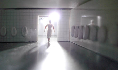 Wo sind sie nun, die Männer? Der Ausgang aus der Einfamilienhaussiedlung ist ein Treppenabgang, der direkt ins unterirdische Reich führt, in die Hygieneabteilung. Dort warten die Klofrauen demütig vor ihren Tellerchen auf Kundschaft.