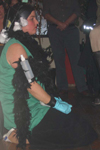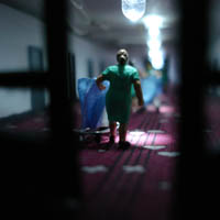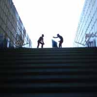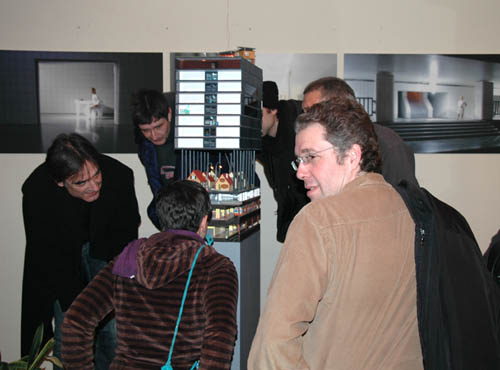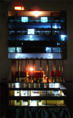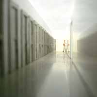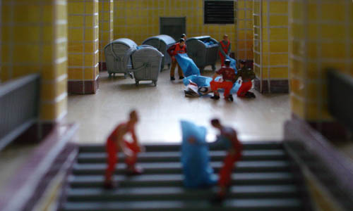 Peter Schmidt hat eine eigene Welt zu Ehren der Putzfrauen und Putzmänner geschaffen. Diese Welt ist sehr beschränkt, genau genommen 25 mal 40 mal 70 Zentimeter groß und die Putzleute messen nicht mal zwei Zentimeter. Trotzdem kommen sie groß raus, denn die kleine Welt ist wieder vergrößert. Sie tritt uns nun in Fotos, die 1 Meter groß sind, entgegen. Die Wirklichkeit, die zuerst geschrumpft und dann wieder aufgeblasen wird, verblüfft, lässt den Betrachter an den Verhältnissen zweifeln. Es geht in dieser kleinen Welt doch modern zu, die Putzfrauen dürfen sich in einem eigenen Motivationstraining von ihrer Firma PutzMunter fit machen und PutzMunter stellt ihnen auch die schöne grüne Arbeitskleidung. Allein über die Bezahlung wird keine Aussage gemacht, aber allzu hoch wird sie nicht sein, denn die Putzfrauen, die die Büros sauber halten, gehören offensichtlich nicht zur "Kernbelegschaft", sind "outgesourced", "Fremdarbeitskräfte", stehen weit unten in der Hierarchie der Industrie- und Dienstleistungsgesellschaft, müssen nachts putzen, wenn der Bürokomplex leer steht. So ergeben sich Bilder von langen Gängen, in denen sich die Frauen verlieren.