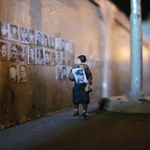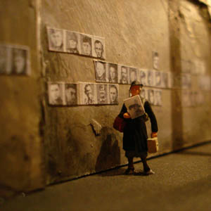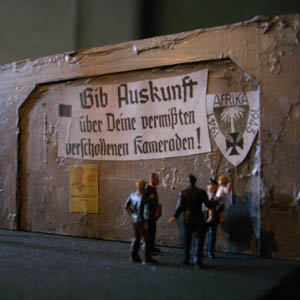 Dr. Hansjörg Kalcyk vom Suchdienst des DRK in München ermöglichte es Peter Schmidt, im Fotoarchiv des Suchdienstes mit Unterstützung von Frau Stoewer zu arbeiten. Hierdurch konnte der erste Teil der Installation sehr genau entsprechend der Suchdienst-Realität nach dem Zweiten Weltkrieg aufgebaut werden. Alle Szenen sind der Wirklichkeit entnommen; die Fotos der Vermissten sind Reproduktionen von Originalen, Adenauer besuchte das Lager Friedland und hielt dort eine Rede, die Kriegsheimkehrer wurden mit Blumen und dem Schriftzug „Willkommen in der Heimat“ empfangen, ehemalige Mitglieder des Afrikakorps trafen sich unter ihrer alten Fahne, das Rote Kreuz findet sich auf einem Plakat neben dem Portrait von Feldmarshall Rommel.