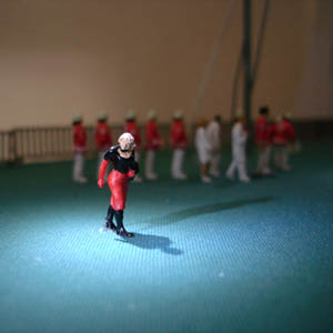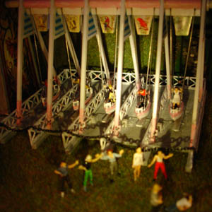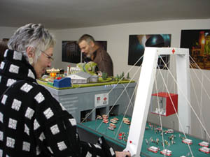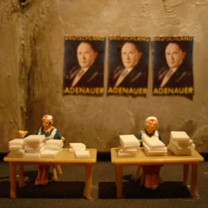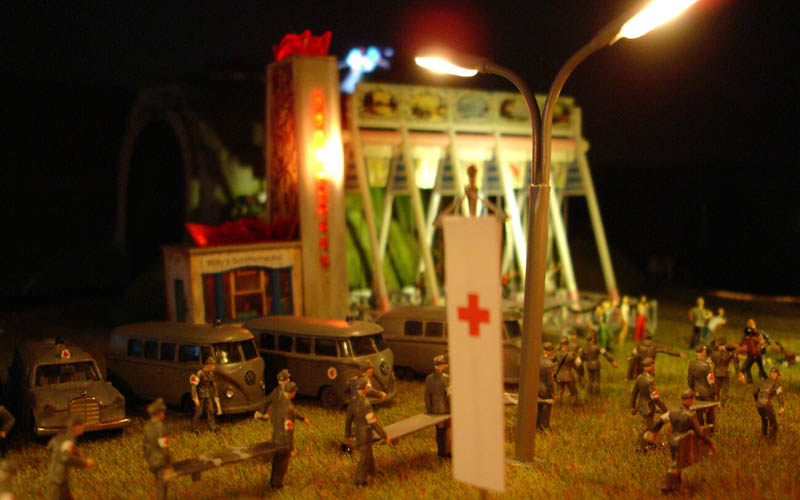 Zum Abschnitt 50er und 60er Jahre war wenig Recherche nötig, denn diesen Teil der Geschichte hat Peter Schmidt selbst erlebt. Als Sohn und Enkel von Sanitätern gehörte er auf dem Unterkochener Kinderfest zur „Rot-Kreuz-Truppe“ dazu, das Rot-Kreuz-Zelt wurde zum Spielplatz. In diesem Bereich der Installation kann der Betrachter die ganze heile Welt des klassischen Eisenbahnmodellbaus und gleichzeitig die Demontage dieser heilen Welt sehen.