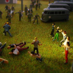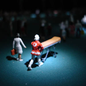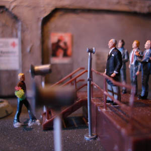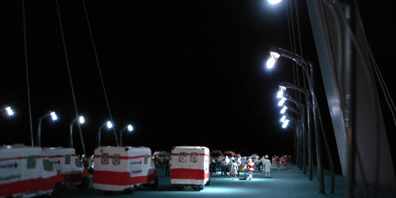 Der Bau der Installation dauerte circa ein halbes Jahr. Die meisten Figuren wurden als Rohlinge gekauft, die Peter Schmidt entsprechend der Szenerie bemalte. Manchmal waren auch Änderungen nötig, so wurden aus Bahnbeamten und Feuerwehrleuten Sanitäter. In den Teil Moderne ist eine kleine Rot-Kreuz-Autosammlung von Jens Rohwer integriert. Für die neuesten Rettungswagen wurde eine Gussform gebaut. Der Boden, auf dem die Moderne steht ist ein Tuch aus dem Operationssaal. Hans-Dieter Ruoff baute die Puls-Elektronik. Der Puls des Betrachters taucht die Anlage in rotes Licht, der Betrachter wird so Teil der Installation.