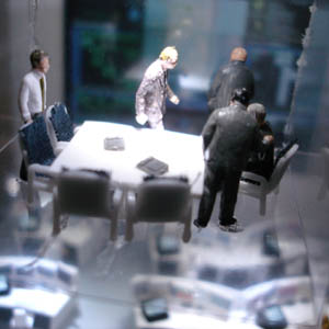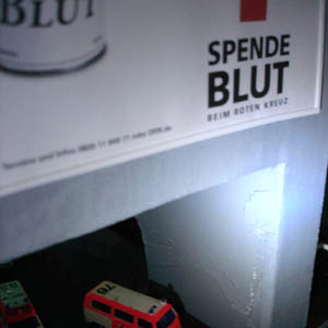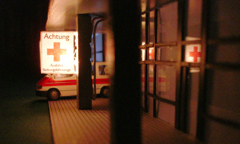 Großzügige Unterstützung erhielt Peter Schmidt vom Roten Kreuz in Stuttgart. Hans Schwaderer von der Integrierten Leitstelle in Stuttgart führte ihn durch die Leitstelle und gab ausführliche Informationen zu den Abläufen, wo die Notrufe aufgenommen werden, wie sie weitergeleitet werden, zeigte auch, wo in zukünftigen Katastrophenfällen der Krisenstab sitzen wird. Oliver Braun von der Hauptrettungswache des DRK Stuttgart erklärte Peter Schmidt wie der Anruf der Leitstelle zum Rettungseinsatz führt, wie der Wachdienst abläuft, wo sich die Sanitäter aufhalten, zeigte die Einrichtungen der Rettungswache wie die Dekontamination und die Ausstattung der Rettungswagen. Cornelia Kling vom (DRK Stuttgart?) steuerte viele Hintergrundinformationen und Literatur bei und ein Modellauto, das jetzt Teil der Installation ist.