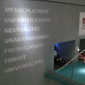 Am Anfang stellte sich die Frage, welches Rote Kreuz in der Installation dargestellt werden sollte? Das Rote Kreuz als Symbol oder als Organisation? Das Internationale Rote Kreuz, das Deutsche Rote Kreuz, das Rote Kreuz von Solferino bis heute? In langen Diskussionen mit Jens Rohwer, dem „Rot-Kreuz-Experten“, wurde dann beschlossen: Das Rote Kreuz der Bundesrepublik Deutschland sollte es sein, vom Ende des Zweiten Weltkriegs bis heute. Die erste Idee, den Nationalsozialismus direkt einzubeziehen, wurde verworfen, die Rolle des Roten Kreuzes im Nationalsozialismus war zu eindimensional, um in der Installation dargestellt zu werden. Das Deutsche Rote Kreuz war schlicht und einfach eine Nazi-Organisation mit dem Hakenkreuz im Emblem, das dem eigenen Grundsatz, jedem zu helfen, der in Not ist, nicht gerecht wurde.